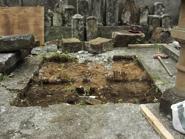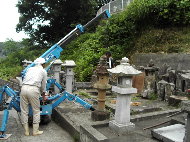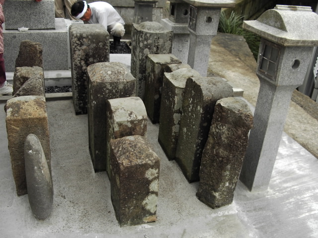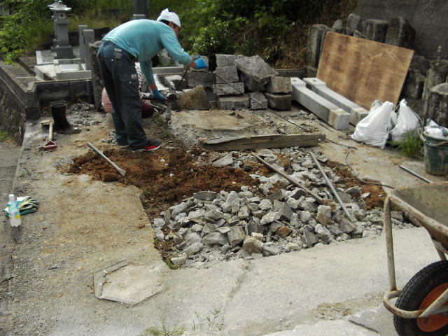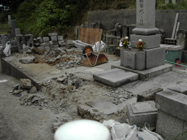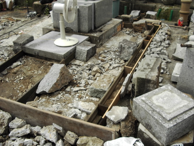 竿の部分は残し、後にきちんと置き直しします。竿とは名前などの書いてあるメインの墓石です。それを取っちゃうと何が何の墓かわからないですからね。