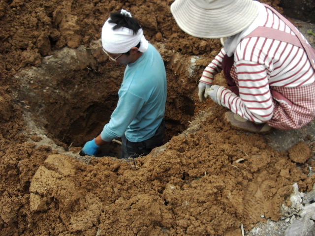 穴堀りの風景です。石材屋さんのお話では人の腰くらいまで掘らなくてはいけないとのことで、必死で掘りました。