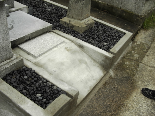 お墓の上がりたちはブロック塀だったのですが、フラットに変更致しました。水切り、ゴミなどが溜まる事のないようにしました。